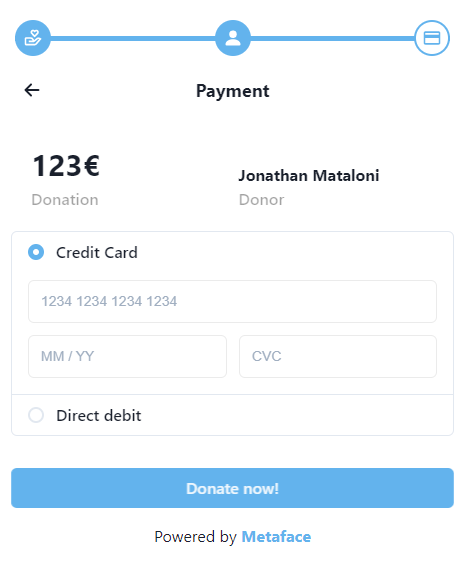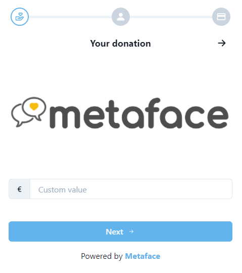 The Metaface widget is a simple payment wizard to easily collect donations from your website. It can be easily integrated with Google Analytics to track the flow of the donations and automatically adapts to every size and device. It consist of 3 successive steps, which can be customized in order, requirements and appearance: