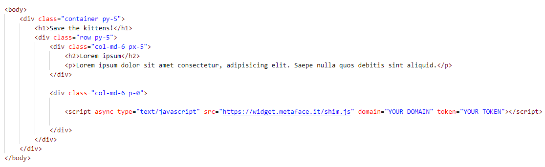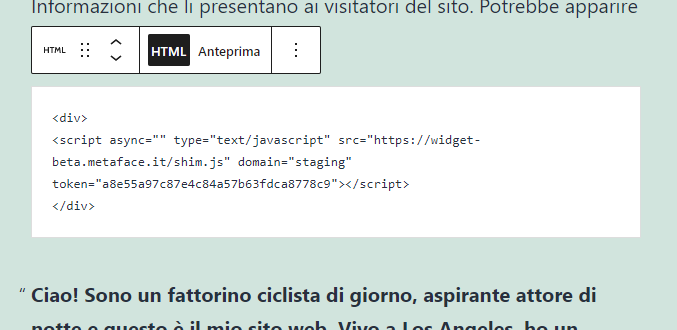 To insert the widget in your web page you need the script generated by Metaface in the "Embed code" section of the "Widget" page, which looks like the image below: